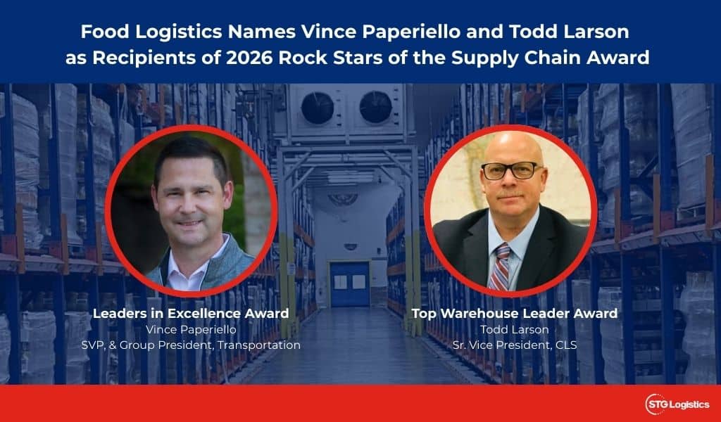 COLUMBUS, OH – February 2, 2026 / Food Logistics, the only publication exclusively dedicated to covering the movement of product through the global cold food supply chain, named Vince Paperiello, STG’s executive vice president & group president, Transportation, with a Leaders in Excellence award. In addition, it named Todd Larson, senior vice president, CLS, with a Top Warehousing Leader award.